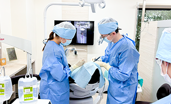 インプラント治療をして終わりではなく、当院では患者さんが治療後も安心して生活を送れるようにアフターケアをさせていただきます。歯科医師や歯科衛生士が連携したチーム医療で、インプラント周囲炎の予防やレーザー治療を行います。歯周病関連の学会で認定を受けた衛生士も在籍しており、丁寧にケアさせていただきます。
