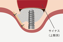 上顎の奥歯部分は骨の量や厚みが少ないため、インプラント治療時には骨造成を行うことがあります。広範囲において骨を作りたい場合、サイナスリフトという方法を用います。水平方向に歯ぐきと骨を開き、対象の箇所へ骨補填材を入れて骨を再生させます。