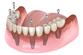 片顎あたり6本のインプラントを顎骨に埋め込み、そこへ入れ歯を装着する方法をオールオン6と言います。ご自身では入れ歯を取り外すことはできず、インプラントと入れ歯はしっかりと固定されています。咀嚼機能が高いため、食べ物を噛む感覚にこだわりたいかたはオールオン6がおすすめです。